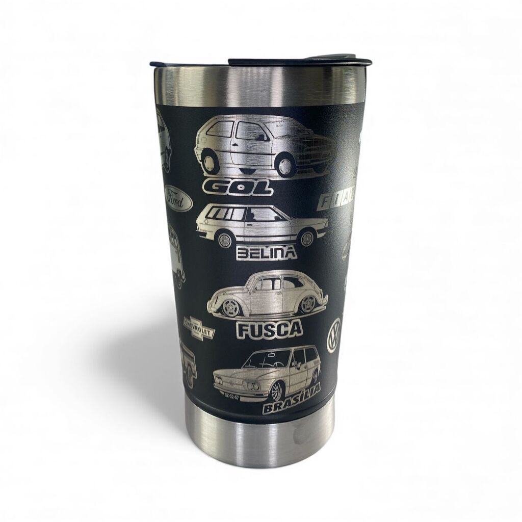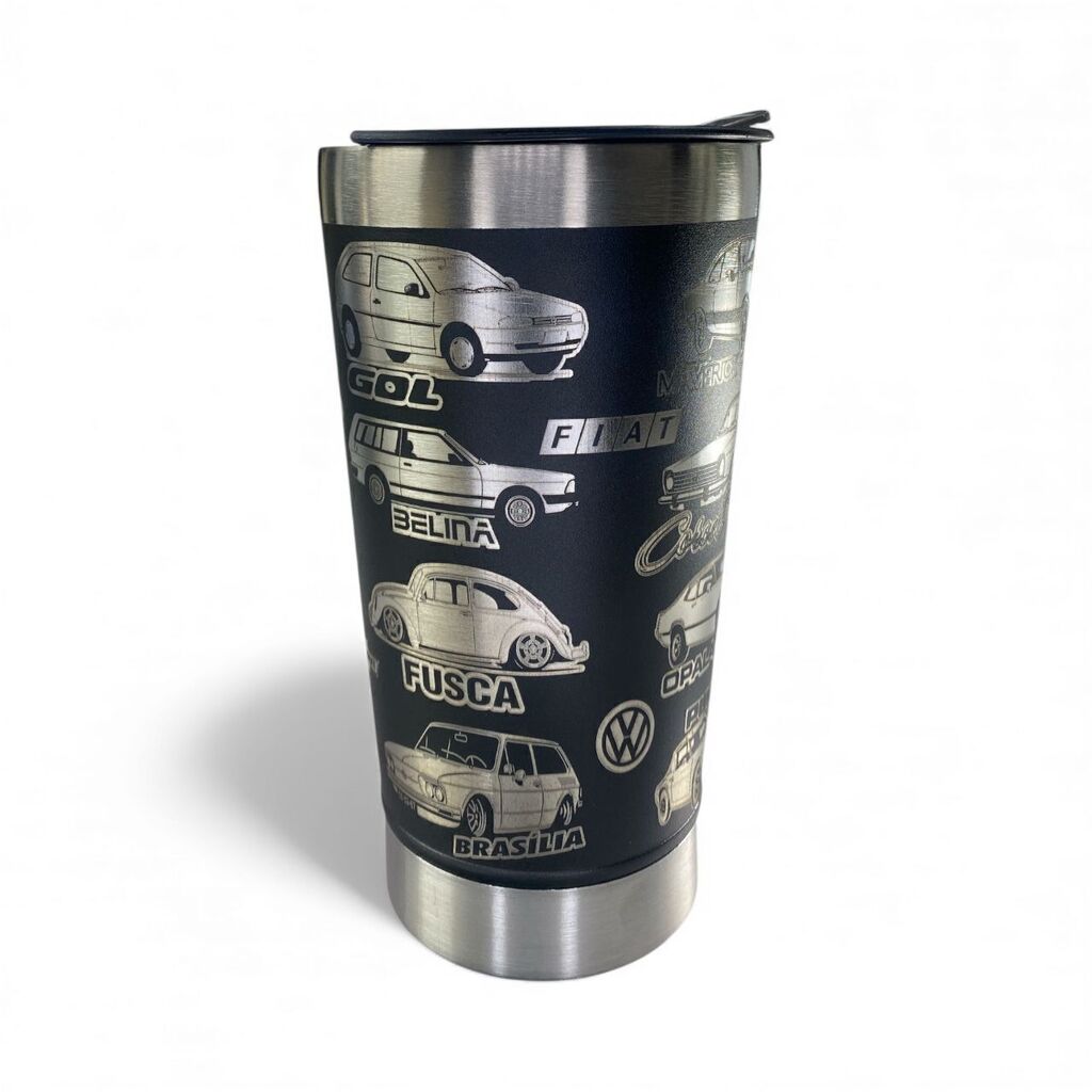 Para os apaixonados por carros antigos, este Copo Térmico é pura nostalgia sobre rodas. Com ilustrações em estilo retrô dos maiores ícones automotivos - Fusca, Opala, Maverick, Kombi e muito mais - ele une estilo e muita personalidade.