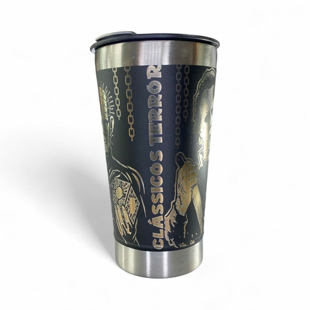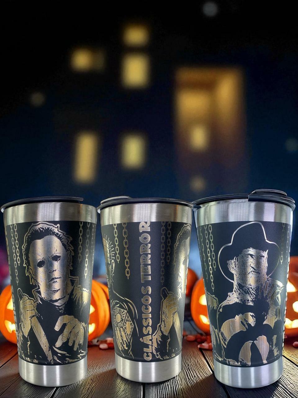 Entre no clima dos maiores ícones do cinema de terror com este copo térmico exclusivo dos Clássicos do Terror. Gravado a laser em 360º, ele traz um design sombrio e impressionante com personagens que marcaram gerações: Freddy Krueger, Michael Myers e Pinhead.