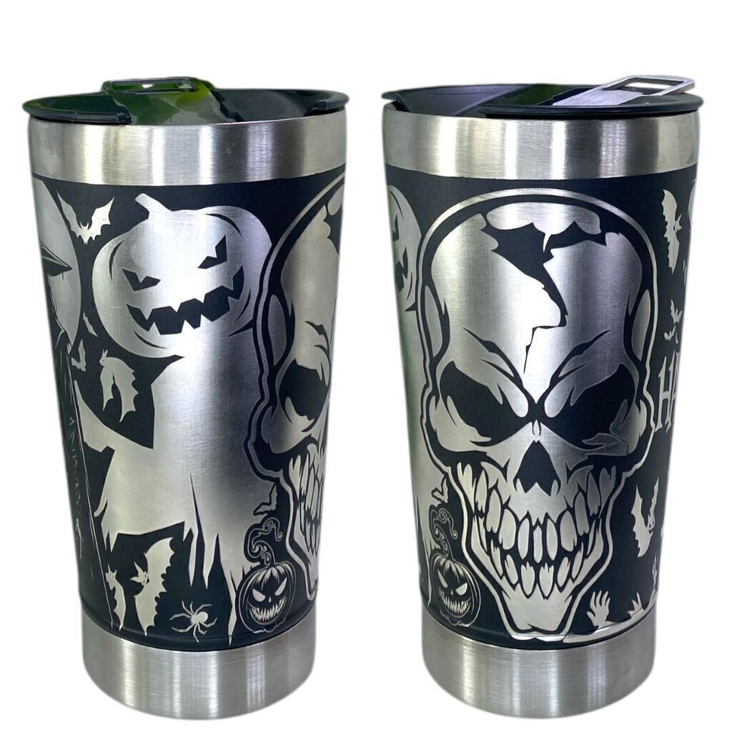 Entre no clima do Halloween com este copo térmico o modelo traz estampas de caveira, morcegos, bruxa