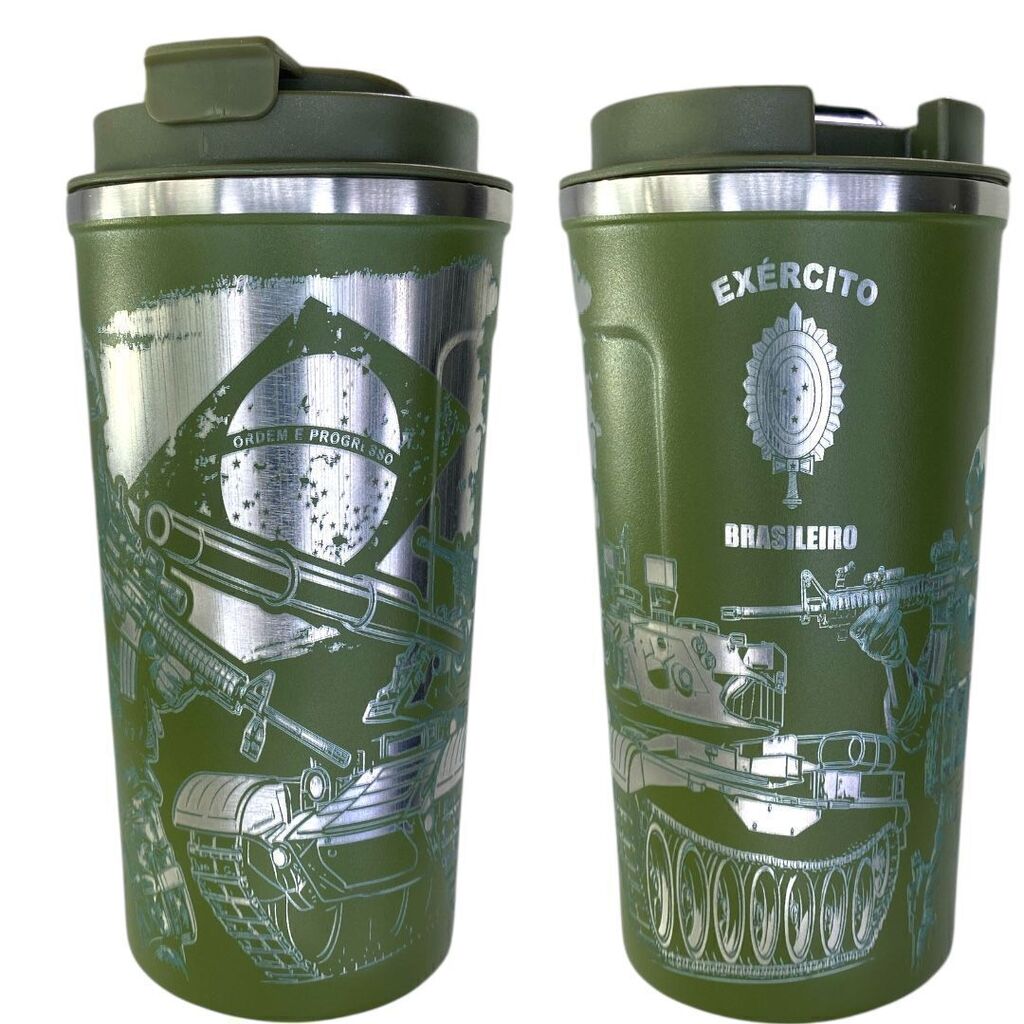 Com gravação a laser o copo traz o brasão do Exército Brasileiro, a Bandeira nacional e detalhes realistas do veículod e armamentos resultando em um visual marcante e cheio de identidade militar.
